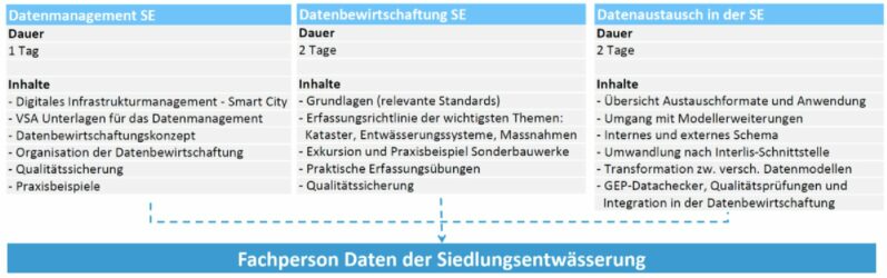 In unserem vielschichtigen Engagement im Datenmanagement Siedlungsentwässerung haben wir erkannt, dass die Wissensvermittlung zu diesem Thema in der Branche ein zentraler Erfolgsfaktor ist. Mit dem VSA haben wir die drei Module «Datenmanagement SE», «Datenbewirtschaftung SE» und «Datenaustausch in der SE» entwickelt und die Kursorganisation zusammen mit verschiedenen Referenten und Referentinnen aufgebaut. Seit Beginn der Kurse engagieren wir uns in der Leitung und als Referenten zu einzelnen Themen.
